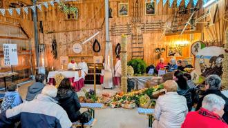 Zum Abschluss segnete Pater Georg den Erntealtar, die mitgebrachten Erntekörbe und die Kuchenpäckchen. Viele fleißige Bäckerinnen hatten sie mit Liebe zubereitet – wer wollte, konnte sich ein Päckchen mitnehmen und mit einer Spende die Innenrenovierung unterstützen.