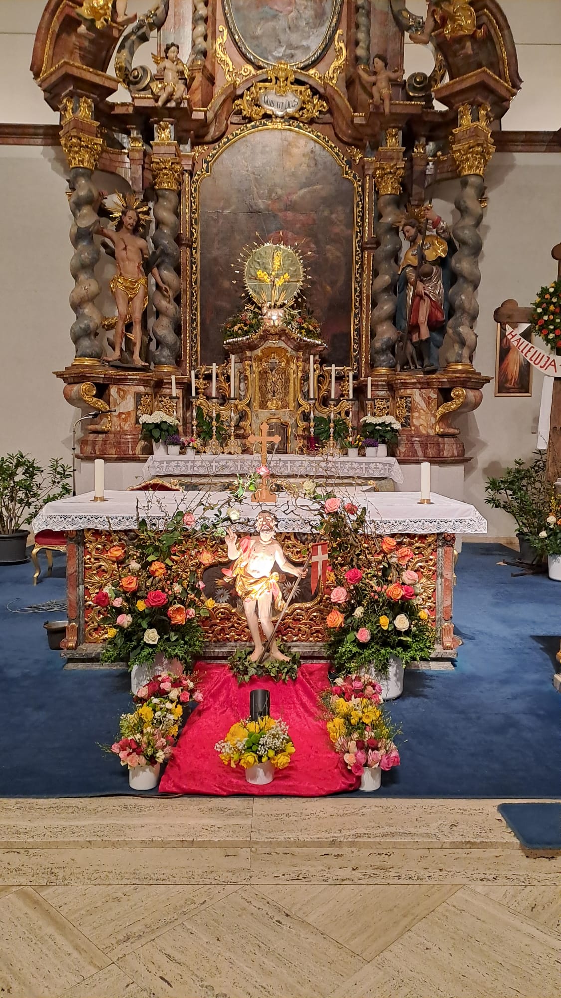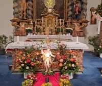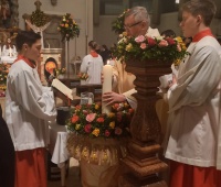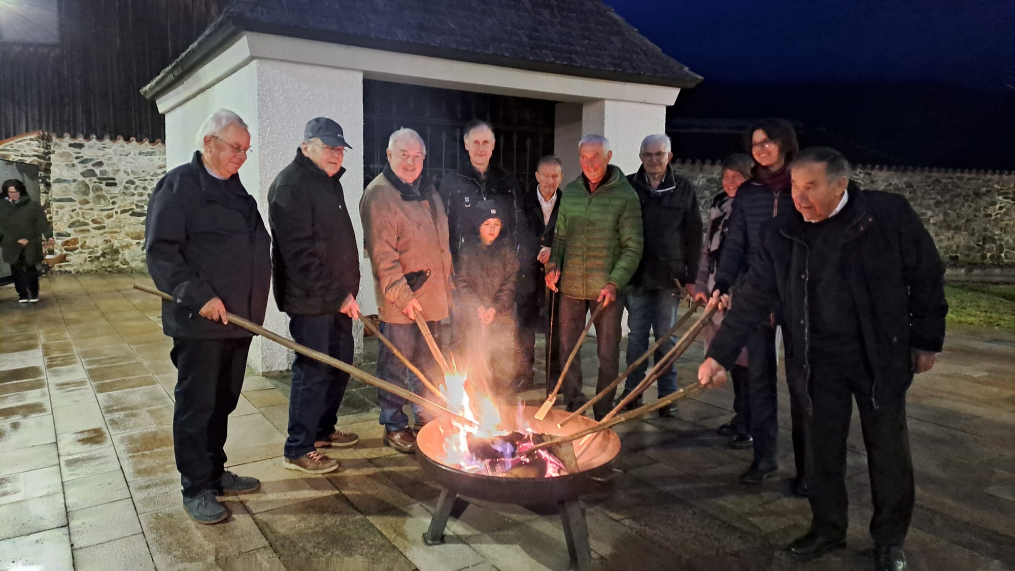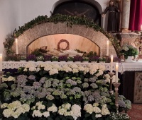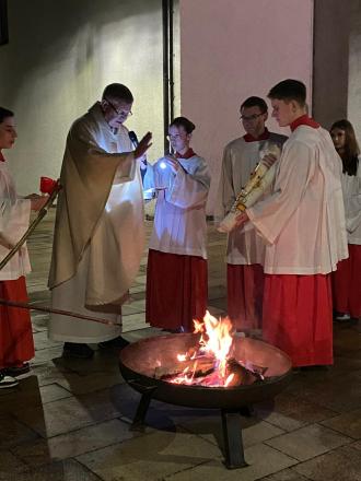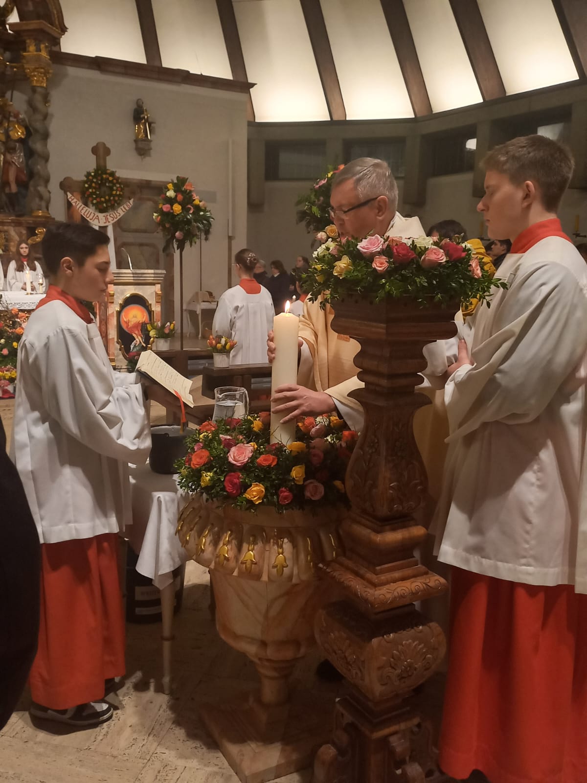 "Lumen Christi" (" das Licht Christi"), sang Pfr. Dr. Tauer beim Einzug in die völlig dunkle Pfarrkirche, nachdem die Osterkerze am gesegneten Osterfeuer soeben geweiht worden war. "Deo gratias" ("Dank sei Gott"), antwortete jeweils die Gemeinde, bis nach dem dritten Mal das Licht der Osterkerze von den Ministranten an die Gottesdienstbesucher verteilt wurde und es in der Kirche "kerzenlichthell" wurde und der Zelebrant das Lob der Osterkerze anstimmte, dem die drei Lesungen aus dem Alten und nach dem Gloria Lesung und Evangelium aus dem Neuen Testament folgten. In seiner Predigt erinnerte Pfr. Tauer an das auf allen Osterkerzen der Pfarreiengemeinschaft dieses Jahr gemeinsame Motiv vom Weizenkorn in der Erde, dem eine Ähre in Kreuzform mit vielen Körnern entsprießt. Das Symbol verbindet Eucharistie, Tod und Auferstehung miteinander, wie die Gottesdienste vom Letzten Abendmahl am Gründonnerstag, die Liturgie vom Leiden und Sterben Jesu am Karfreitag und die Osternachtfeier ein einziger Gottesdienst sind, der am Gründonnerstag mit dem Kreuzzeichen beginnt und erst am Ende der Osternacht wieder mit dem Kreuzzeichen endet. Dazwischen endet und beginnt alles ohne Kreuzzeichen: die drei Gottesdienste sind ein einziger, ein einziges Gebet. Zur Taufwasserweihe wurde die brennende Osterkerze in das Wasser eingesenkt, um ihm unter dem Segensgebet die Weihe zu übertragen. Am Ende der Osternacht bedankte sich Pfr. Tauer bei allen Diensten und Helfern, die nicht nur aus den Blumen der Kreuzverehrung vom Karfreitag in kürzester Zeit den herrlichen Osterschmuck gezaubert hatten, sondern die Kirche während dieser Tage immer wieder umräumen und das hl. Grab in der Seelenkapelle aufbauen mussten. Chor und Kantoren unter der Leitung von Fr Julia Häring begleiteten - nach dem Gloria des Gründonnerstag ohne Orgel bis zum Gloria der Osternacht - wie die Mesnerinnen, Lektoren und Ministranten die Gottesdienste mustergültig. Am Ende der Osternacht segnete Pfr. Dr. Tauer traditionell die mitgebrachten Osterspeisen. (Fotos vom Osterfeuer von Christine Weiss; von der Taufwasserweihe von Brigitte Perlinger)